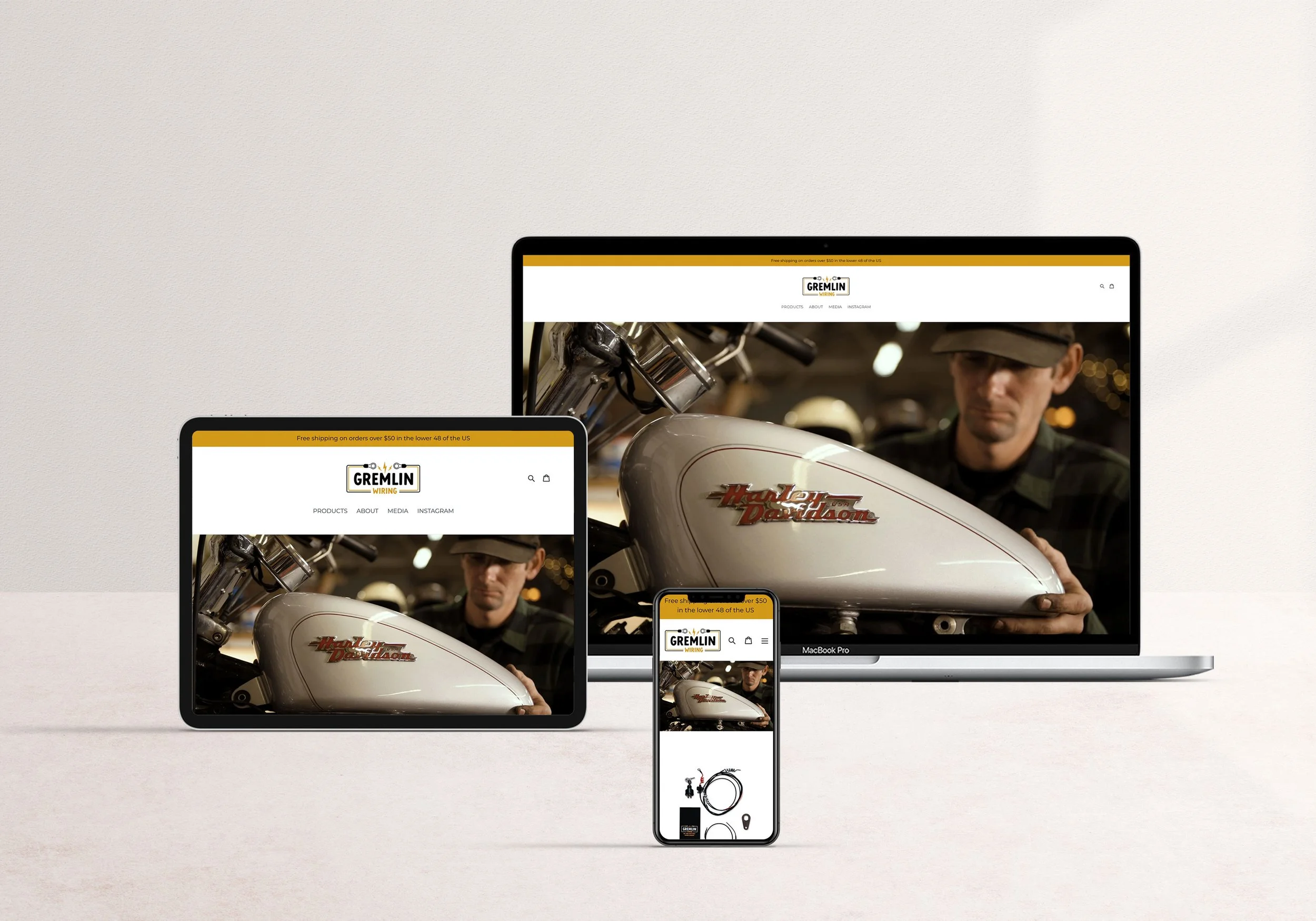 I was brought on by Gremlin Wiring to design a full rebrand that best highlighted the overall journey of the company. We agreed that keeping a clean simple layout would work best to parallel the clean lines and simplicity of the product sold. Upon doing research, I felt like it was important for Gremlin Wiring to stand out from other companies that sold Harley Davidson specific products. Instead of focusing on loud colors and imagery, I chose to let the product and brand story do the talking by using light tones and highlights.
