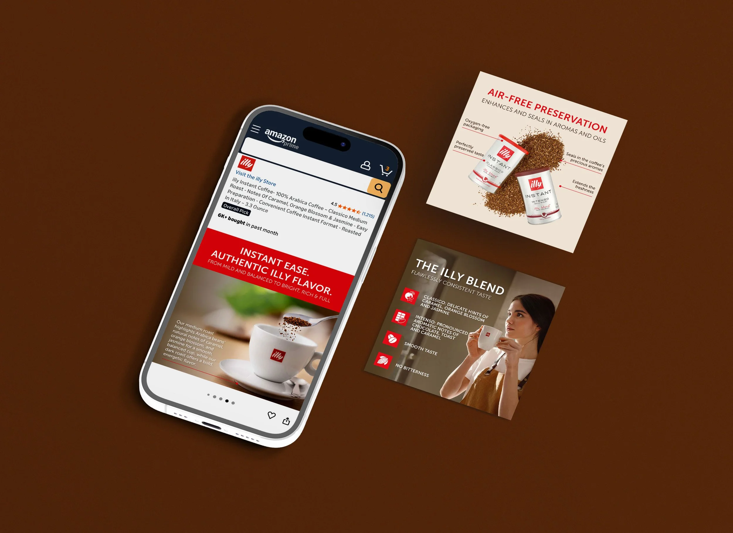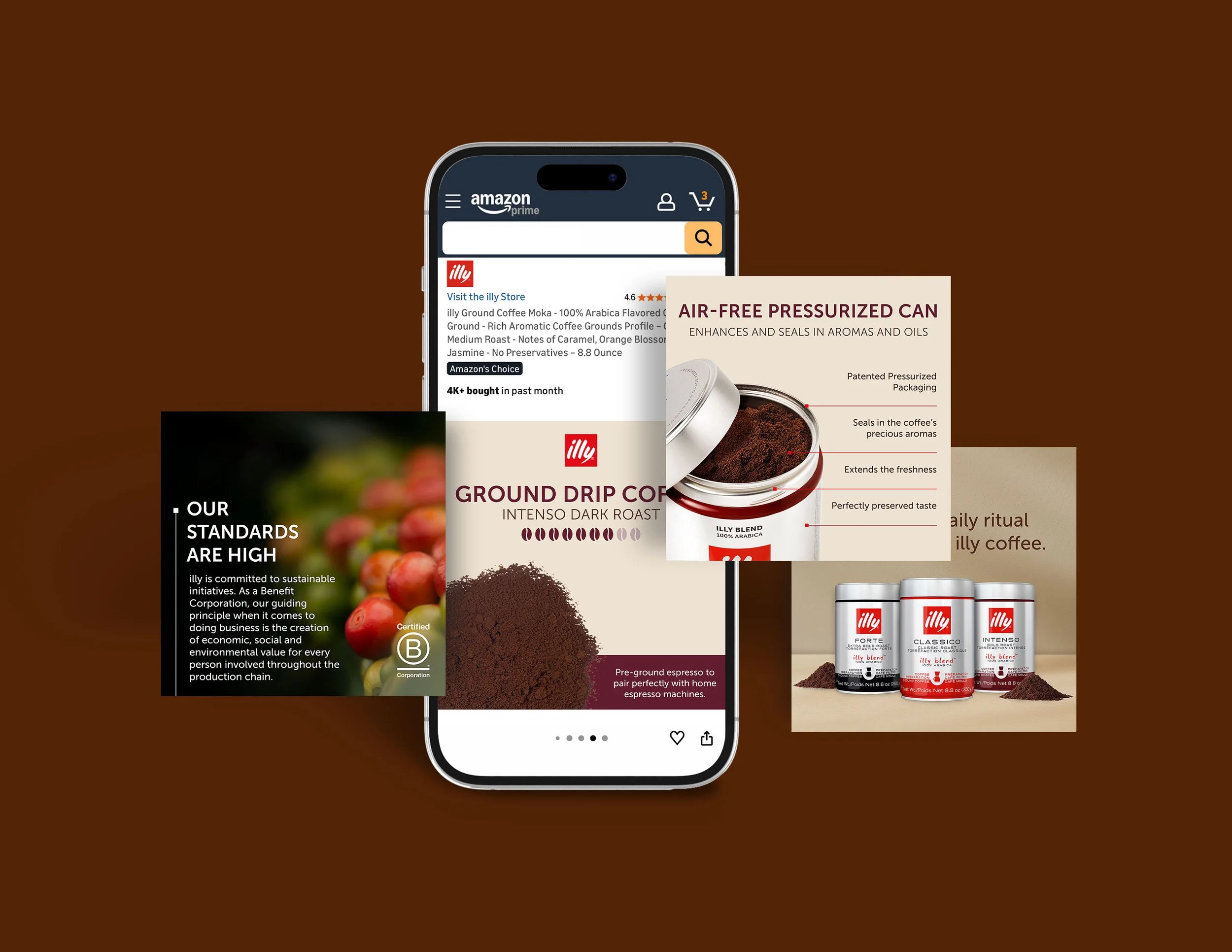 Translating a world-class brand identity onto Amazon is no small task. Premium positioning is fragile on a marketplace built for price comparison, where illy sits shoulder to shoulder with mass-market competitors holding more than three times its market share. The challenge was to communicate nearly a century of Italian heritage and uncompromising quality within the constraints of a product listing and a few seconds of a shopper's attention. Every visual asset and line of copy had to stop the scroll, earn trust, and justify the premium before a customer ever opened the can.