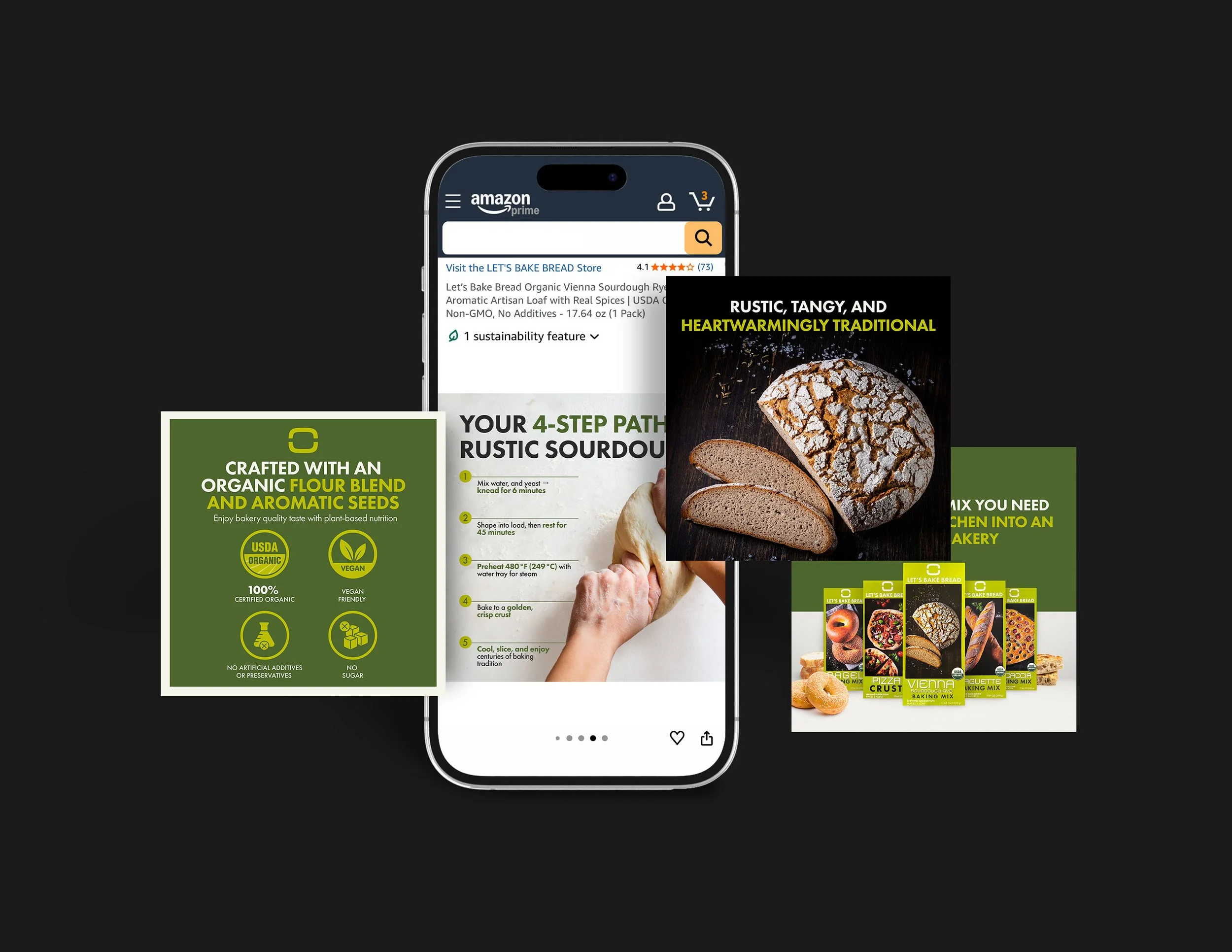 With Amazon as the primary retail channel, all creative assets were purpose-built for the platform. A+ Content modules, Image Stack layouts, and a fully designed Storefront were produced to create a premium, editorial-quality shopping experience that sets Let's Bake Bread apart in a crowded marketplace. Every asset was considered not just as a standalone piece, but as part of a unified brand story designed to build trust, communicate quality, and convert at the shelf.