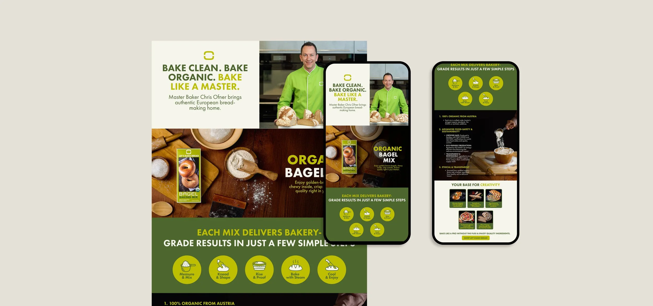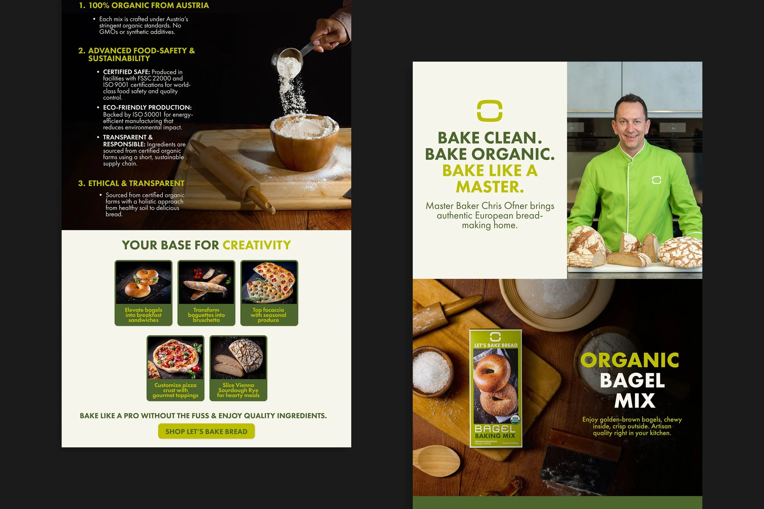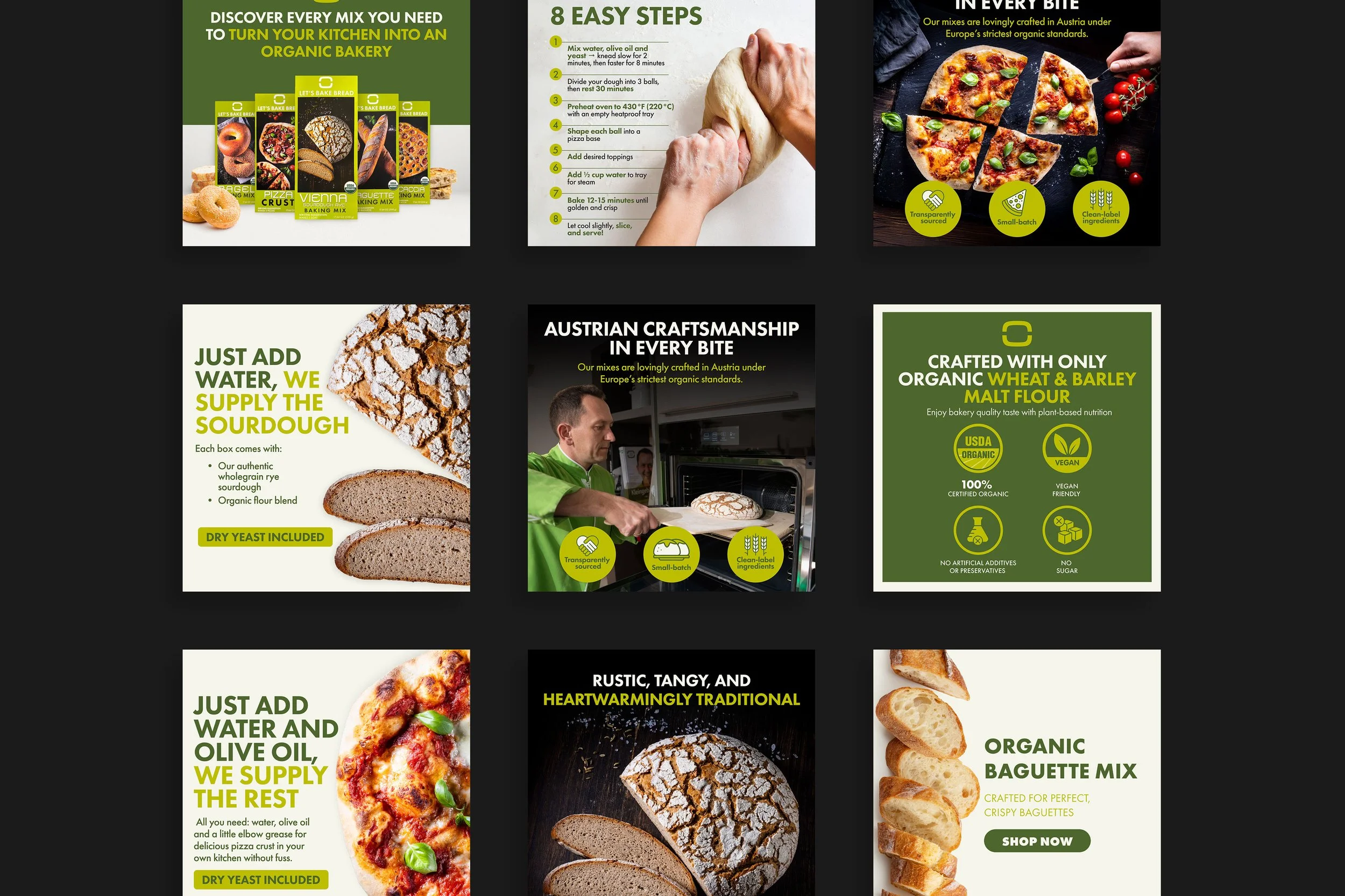 The final deliverables represented a significant elevation from anything the brand had produced previously. Where earlier creative lacked the cohesion and refinement needed to communicate Let's Bake Bread's premium positioning, the new identity gave the brand a visual foundation worthy of the product inside the box. Clean, organic, and distinctly European in sensibility, the design system brought an authenticity and intentionality to the brand that had not existed before.